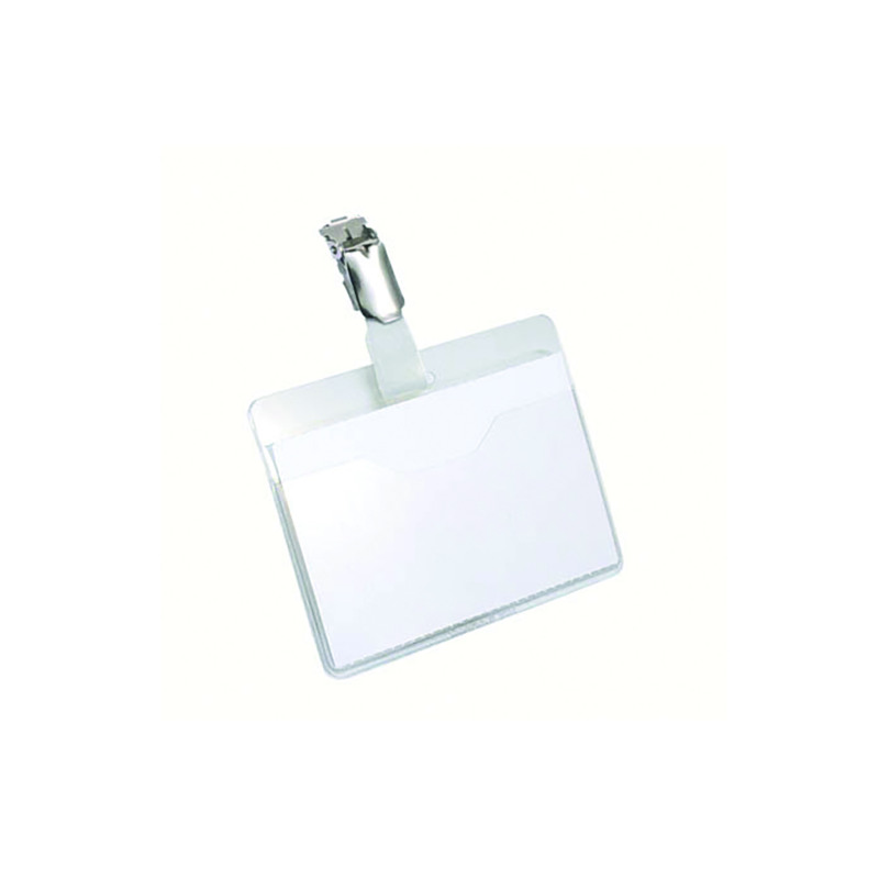 Durable transparent hard PVC visitor badge in landscape format. The badge has a drop level front which allows for easy removal and replacement of inserts. Includes a rotating metal clip for vertical support and blank insert cards measuring 60x90mm.