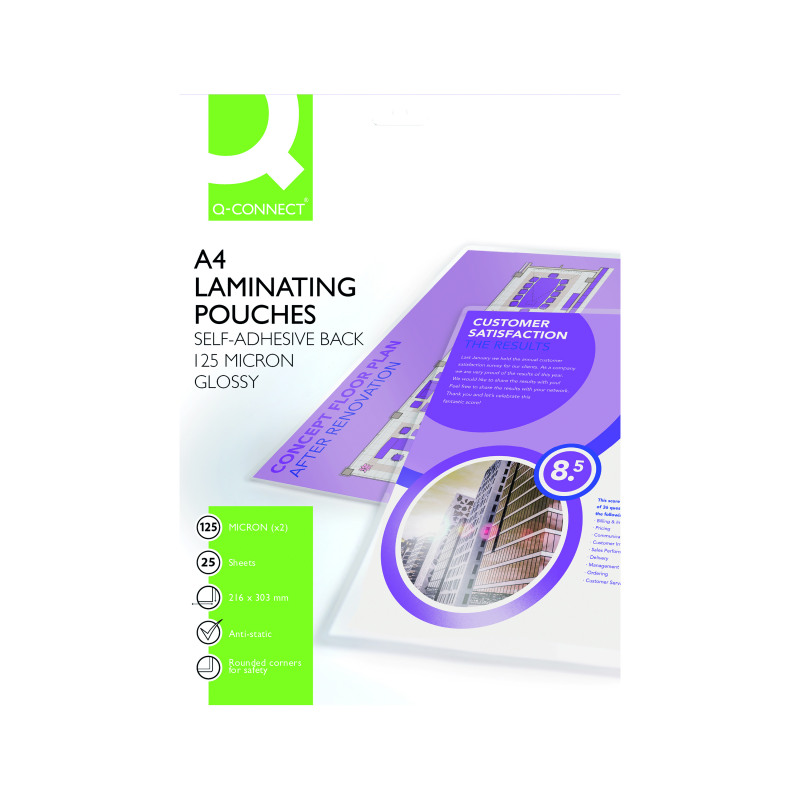 Laminated documents are waterproof, tear proof and protected against damage. Perfect for archiving, posters or signage, these Q-Connect self-seal laminating pouches are ideal for the total encapsulation of documents, providing the means for a permanent record and professional looking results. This pouches also have a self-adhesive back for applying signs, posters and more to walls and notice boards. Q-Connect offer high quality office supplies designed to give your business an effective solution to all your stationery needs. These laminating pouches come in a pack of 25.