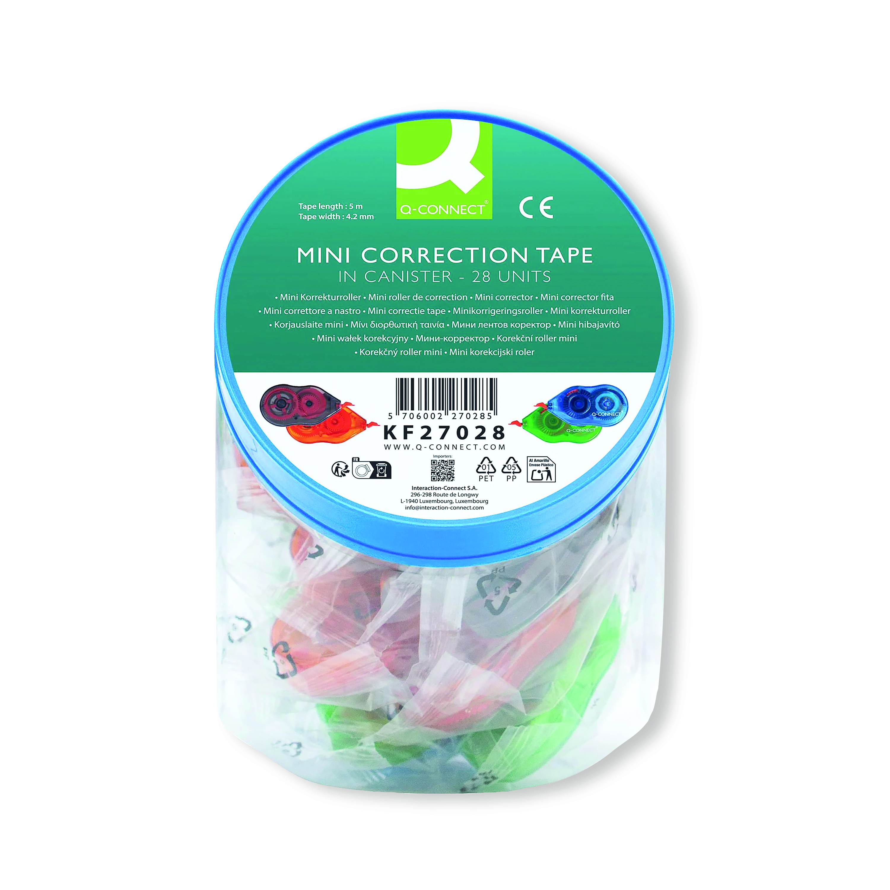 This high quality Q-Connect Mini Correction Roller provides a quick and simple way to correct written or printed errors. The tape measures 4.2mm x 5m and provides a smooth surface for instant correction. The compact correction roller also features a tensioning button and transparent case. This pack contains 24 mini correction rollers.